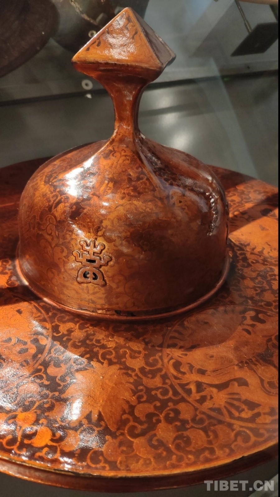 14號(hào)藏品為僧官帽,出自西藏,進(jìn)入館藏時(shí)間為1905年。據(jù)博物館介紹,這頂漆帽原屬于寺院一位僧官所穿服飾的一部分。過去,西藏地方政府實(shí)行“政教合一制度”,寺院作為一個(gè)地方的宗教事務(wù)和寺院自身的管理者和統(tǒng)治者,同時(shí)又是這個(gè)地方社會(huì)的主要管理者和統(tǒng)治者。因此,遍布西藏各地的寺院往往都是當(dāng)?shù)氐恼?、?jīng)濟(jì)、文化中心,具備政治、經(jīng)濟(jì)、教育、司法等職能。寺院內(nèi)部設(shè)立不同級(jí)別或不同分管領(lǐng)域的僧官來共同管理整個(gè)寺院的內(nèi)外政教事務(wù)。