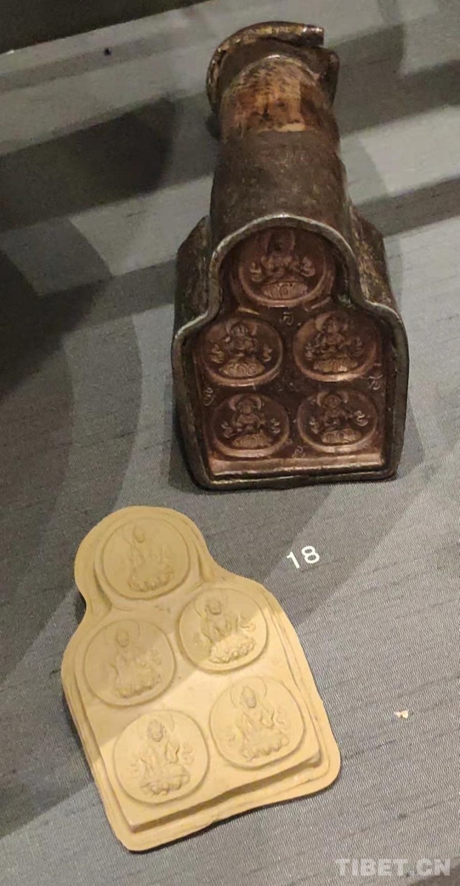 “擦擦”模具,出自西藏,模具為鐵質(zhì),手柄為木質(zhì),一模五腔,進(jìn)入館藏時(shí)間為1905年?!安敛痢币糇g自梵語,意思是“復(fù)制”,指一種模制的泥佛或泥塔。藏傳佛教認(rèn)為,制作“擦擦”可積攢善業(yè)功德,并將其視為消災(zāi)祈福的圣物?!安敛痢北黄毡楣┓钣谏裆健⑸竦?、寺廟旁,大路中央或交叉路口。還有的“擦擦”存放于大佛像的體內(nèi)、佛塔中央。除以上的供奉方式外,“擦擦”還常被安放于隨身佩帶的“嘎烏”之內(nèi),充當(dāng)護(hù)身符。
