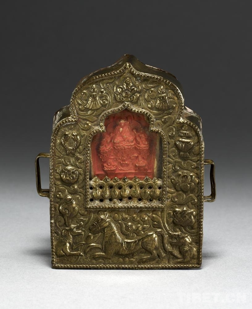 19號(hào)藏品為銅制“嘎烏”,內(nèi)裝有“擦擦”和香料包,出自西藏,進(jìn)入館藏時(shí)間為1905年?!案聻酢?,是藏語的音譯,指護(hù)身佛的盒子,即小型佛龕。盒子里一般裝有“擦擦”佛像、印著經(jīng)文的綢片、舍利子或者甘露丸、由高僧念過經(jīng)的藥丸,以及活佛的頭發(fā)、衣服的碎片等?!案聻酢边€是精美的裝飾品。其形狀不一,一般為銀質(zhì)或銅質(zhì),盒面上鑲嵌有瑪瑙、綠松石,雕刻有多種花紋圖案。