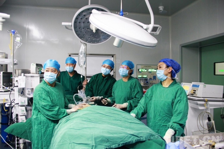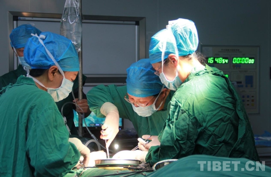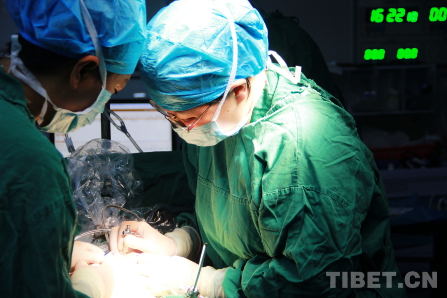 圖為航空總醫(yī)院婦科主任余立群(右二)在手術(shù)中指導(dǎo)甘孜縣人民醫(yī)院醫(yī)生操作手術(shù) 攝影:劉莉