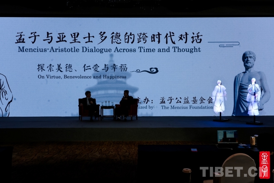 儀式上,以孟子與亞里士多德為人物形象的全息影像對話逐步展開。孟子公益基金會理事長孟亮與聯(lián)合國可持續(xù)發(fā)展解決方案網(wǎng)絡主席杰弗里?薩克斯作為對話人。此次對話聚焦孟子和亞里士多德對美德、仁愛的詮釋,以及兩者之間存在的共通性等。包括孟亮和薩克斯的對話環(huán)節(jié)、現(xiàn)場嘉賓的提問環(huán)節(jié)。全息影像形式新穎,現(xiàn)場問答氣氛活躍,實現(xiàn)了一場中西方文明跨越時間與空間的對話。(中國西藏網(wǎng) 記者/趙婧茹)