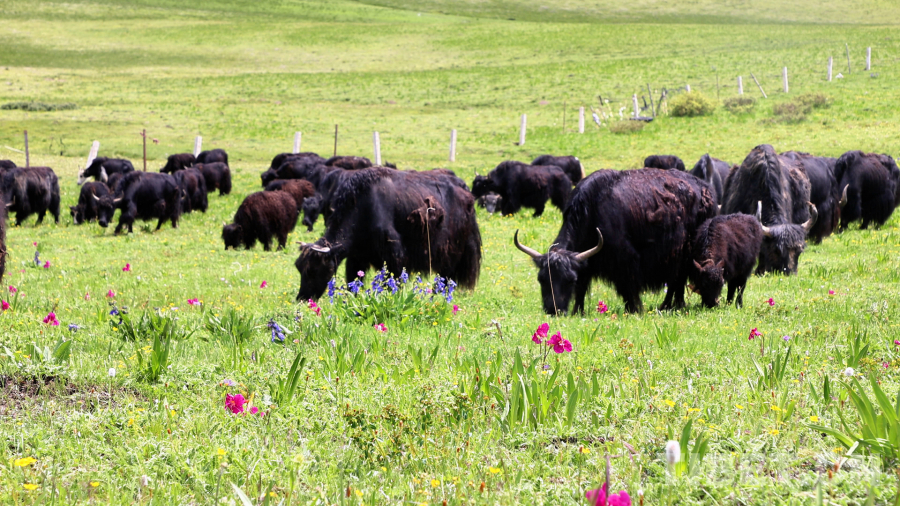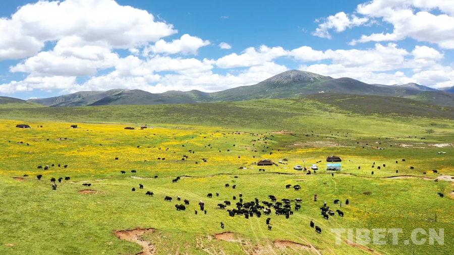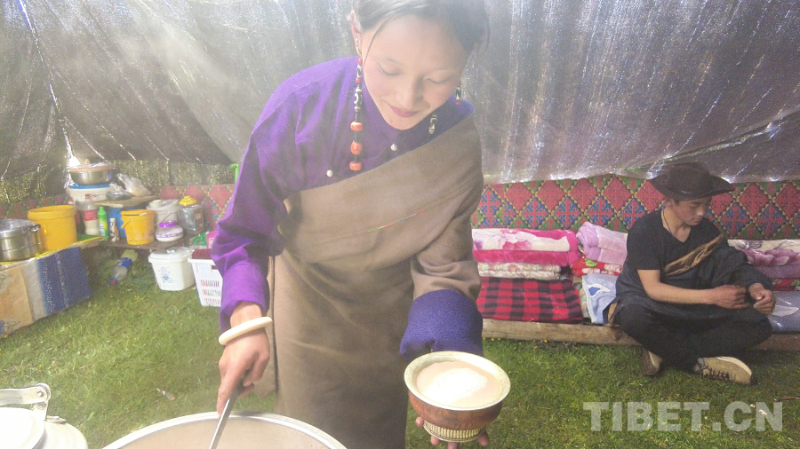 早晨天剛蒙蒙亮,他們就準備出發(fā)了,一家人把生活必需品黑帳篷,火爐,鍋碗瓢盆,被褥及酥油糌粑等物資打包裝車,由家人先駕駛拖拉機把所有物資運送到夏季遠牧點,四郎彭措則和他的侄兒騎馬趕牛出發(fā)。冬季牧場到夏季牧場距離60公里,他們經(jīng)過9個小時的遷徙,終于在下午3點到達夏季牧場。此時他的家人也在鄰居的幫助下搭好了帳篷,煮好了酥油茶等待著他們。到了夏季牧場,牦牛們也迫不及待奔向了肥美的水草,四郎彭措和他的侄兒也終于可以卸下滿身的疲憊,品嘗家人們準備好的美食。夏季牧場正是一年當中最美的季節(jié),草原上開滿了五顏六色的花朵,多日不見的好友也帶著自己的家人早一步駐扎在此地,四郎彭措說道:“夏季放牧,轉場雖然辛苦,但也是一年中難得的閑暇時光。夏季水草肥美,牦牛們有充足的食物,來到夏季牧場放牧的牧民也有更多的活動時間,賽馬、唱歌、跳鍋莊舞是我最喜歡的活動?!?/p>