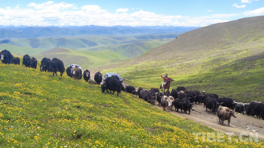 昌臺草原的7月,進入夏季,白玉縣阿察鎮(zhèn)阿察村的牧民們便開始轉移牧場,從冬季牧場日通草原轉移到夏季牧場石門科草原,每一次轉場都是一次大遷徙,氣勢磅礴壯觀。四郎彭措一家也開始了今年的轉場工作,沿著冬季牧場到夏季牧場的牧道,四郎彭措和表弟仁真巴登兩位牧人騎著兩匹駿馬,趕著一群牦牛有序地進行著轉場。