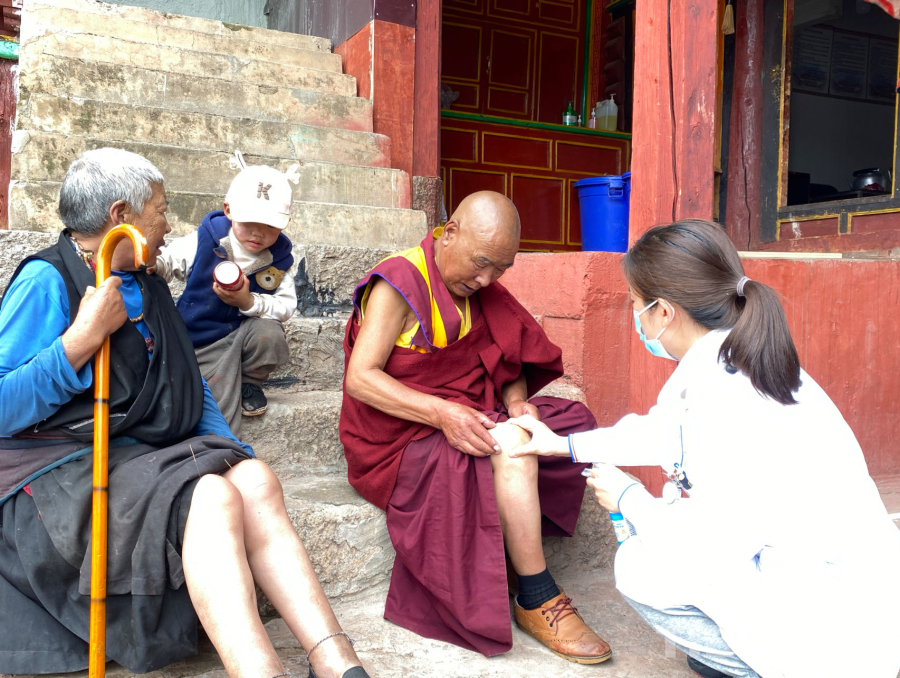 經(jīng)過(guò)與藏族群眾一天的密切交流,北京大學(xué)人民醫(yī)院骨關(guān)節(jié)科學(xué)科助理,骨關(guān)節(jié)科黨支部書(shū)記、主任醫(yī)師李虎,已經(jīng)從本地志愿者那里學(xué)會(huì)了簡(jiǎn)單地用藏語(yǔ)表達(dá)“疼不疼”“不疼吧”,來(lái)為當(dāng)?shù)氐娜罕娺M(jìn)行更加精準(zhǔn)的、直接的診斷。