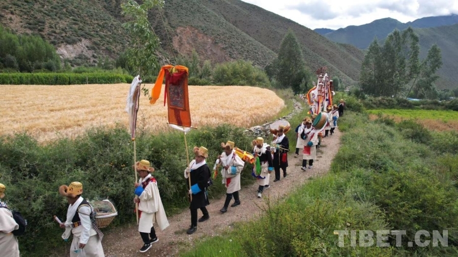 當天清晨,村民們一大早身穿華麗的藏裝,頭戴“次仁金果”、高舉幡旗、身背經(jīng)書、手持青稞麥穗等作物,分成兩隊從村口出發(fā),轉(zhuǎn)村里的每一塊農(nóng)田進行“收斂地氣、祈求豐收”的巡游活動。浩浩蕩蕩的隊伍傾村而出,大家以不同的口號與詠唱,祈求風調(diào)雨順,國泰民安。