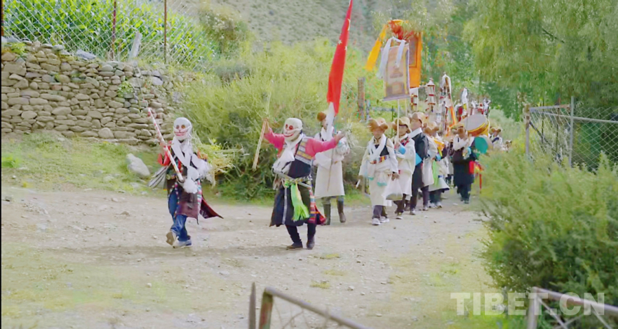 在望果節(jié)這一天,村里會選四位村民扮演成“土鍋杰日”,他們戴著面具,身穿“土鍋杰日”獨有的服飾走進每家每戶表演“羌姆”舞祈求平安順遂、來年豐收。這個特別的儀式蘊含著勞動人民勤勞智慧、團結(jié)互助、尊重自然的價值理念。
