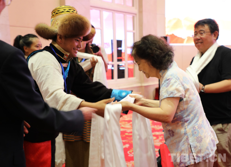 圖為西藏科技專干向北京建藏援藏工作者協(xié)會會員獻上哈達 攝影:王茜