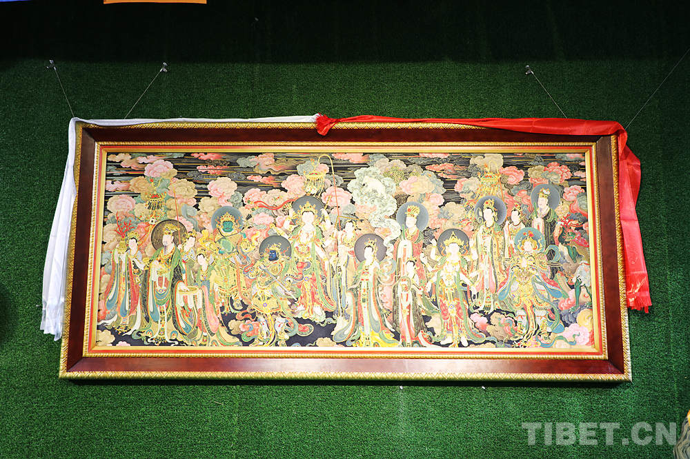 此次展覽中不僅有20余幅不同年代珍貴傳統(tǒng)唐卡,同時還重點展出了掐絲琺瑯唐卡。據(jù)相關負責人介紹,此類作品以傳統(tǒng)手工掐絲為基礎,以金箔、金絲鑲嵌而成,制作技藝復雜、用料講究,風格獨特且具有鮮明民族特點。兩種非遺的結合,是文化傳承與技術創(chuàng)新的生動實踐,讓觀眾在觀賞中體驗到非遺的魅力。