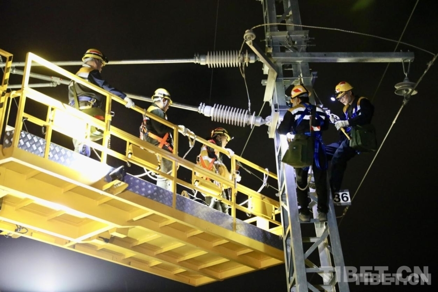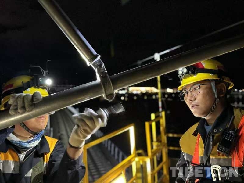 23時(shí)00分,軌道車穩(wěn)穩(wěn)停靠,“天窗”作業(yè)命令下達(dá)。中國(guó)鐵路青藏集團(tuán)有限公司拉薩基礎(chǔ)設(shè)施段供電維修技術(shù)中心拉薩南接觸網(wǎng)維修隊(duì)工長(zhǎng)李積王帶著7名工友走下接觸網(wǎng)作業(yè)車,驗(yàn)電、連接地線端、接掛地線……一系列操作一氣呵成。隨即,現(xiàn)場(chǎng)負(fù)責(zé)人拉加和工友們依次登上距離地面6米高的作業(yè)平臺(tái)上,穿梭于接觸網(wǎng)線索之間,猶如凌空“舞者”。