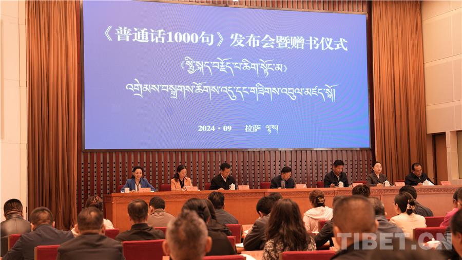 中國西藏網(wǎng)訊 為進(jìn)一步助力國家通用語言文字推廣普及,鑄牢中華民族共同體意識。9月20日,西藏自治區(qū)藏語委辦(編譯局)在拉薩舉行了《普通話1000句》漢藏對照版新書發(fā)布會(huì)暨贈(zèng)書儀式。西藏自治區(qū)政府副主席、自治區(qū)藏語委副主任甲熱·洛桑丹增出席會(huì)議,西藏自治區(qū)藏語委辦(編譯局)黨組副書記、主任(局長)達(dá)娃次仁作新書出版介紹,會(huì)上宣讀了教育部語文出版社發(fā)來的賀信,并向與會(huì)代表贈(zèng)書。
