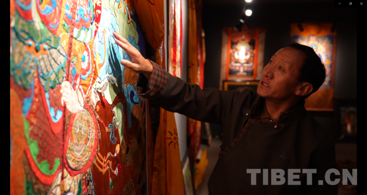 圖為國家級非遺項目拉薩堆繡唐卡傳承人羅布在介紹自己的唐卡作品 攝影:謝林翰
