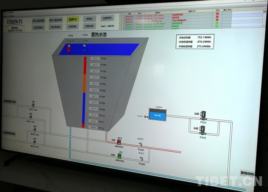 圖為運行控制系統(tǒng)上可實時檢測蓄熱水池中各部分的水溫,平均溫度可達(dá)到60℃左右 攝影:王佳豪