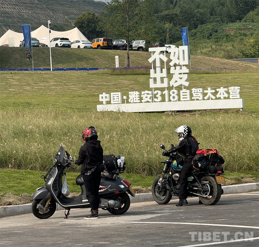 圖為在雅安318自駕大本營(yíng)的門(mén)口騎行去拉薩的兩位女孩 攝影:王妍丹