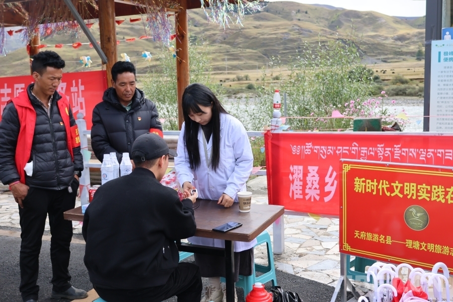 從海拔4700多米的卡子拉山,到一派田園風(fēng)光的濯桑片區(qū);從傳統(tǒng)文化氣息濃厚的勒通古鎮(zhèn),到一望無(wú)際的毛埡大草原,理塘縣共設(shè)立了19處新時(shí)代文明實(shí)踐旅游服務(wù)站,每處站點(diǎn)都配備了至少5名志愿者,從9點(diǎn)到18點(diǎn),全天提供指路問(wèn)詢、文明旅游宣傳、血氧飽和度測(cè)量以及免費(fèi)開(kāi)水、免費(fèi)雨傘、應(yīng)急充電等志愿服務(wù),并協(xié)助交警開(kāi)展交通安全宣傳、文明行車引導(dǎo)等工作。