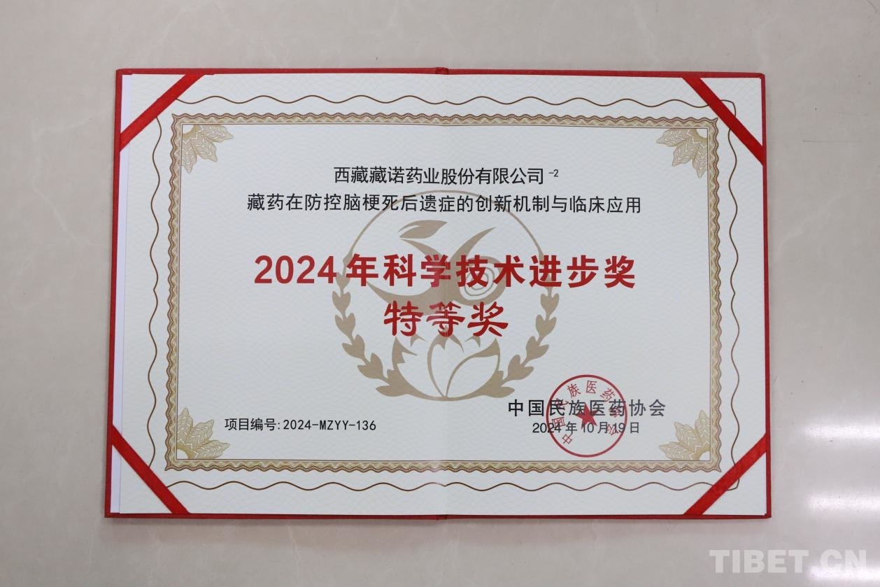 經(jīng)過(guò)申報(bào)、內(nèi)審和組織有院士、國(guó)醫(yī)大師等各民族專(zhuān)家組成的專(zhuān)家委員會(huì)初評(píng)、終評(píng)、公示、報(bào)備等環(huán)節(jié)和程序,由河北醫(yī)科大學(xué)第二醫(yī)院、西藏藏諾藥業(yè)股份有限公司、石家莊藏諾藥業(yè)股份有限公司聯(lián)合申報(bào)的《藏藥在防控腦梗死后遺癥的創(chuàng)新機(jī)制與臨床應(yīng)用》被授予“2024年中國(guó)民族醫(yī)藥協(xié)會(huì)科學(xué)技術(shù)進(jìn)步獎(jiǎng)”特等獎(jiǎng)。