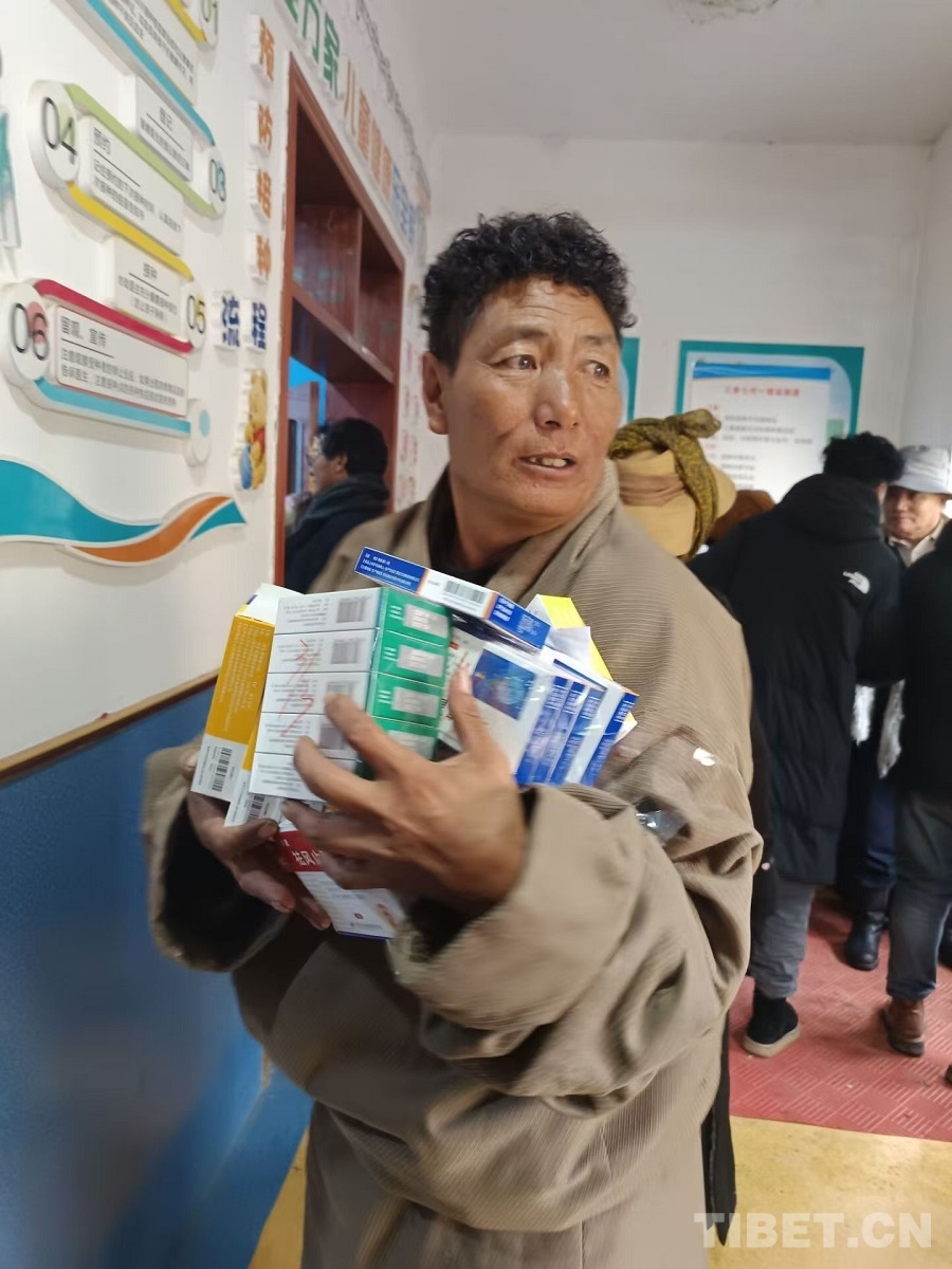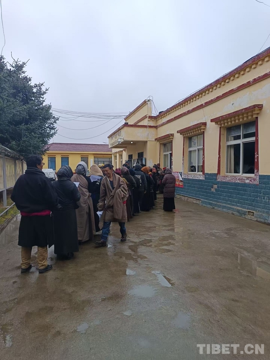 圖為當(dāng)?shù)厝罕娭刃蚓慌抨狀I(lǐng)取捐贈藥品 攝影:賈春玲