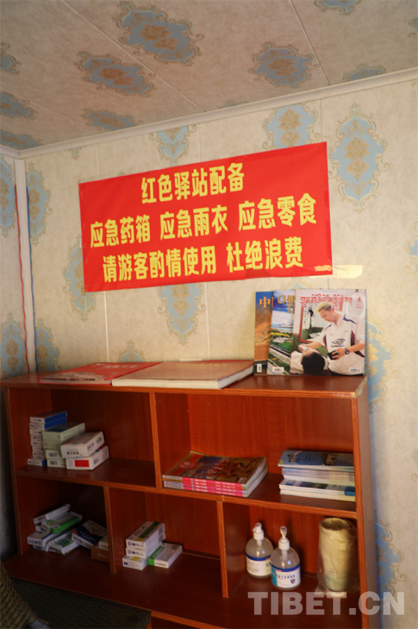 圖為佩枯錯(cuò)旁邊的石榴籽紅色驛站內(nèi)免費(fèi)配備的藥物、洗手液、紙杯、雜志等物品,記者也將《中國(guó)西藏》雜志擺放在內(nèi),希望給游客的旅程帶去一些收獲 攝影:王茜