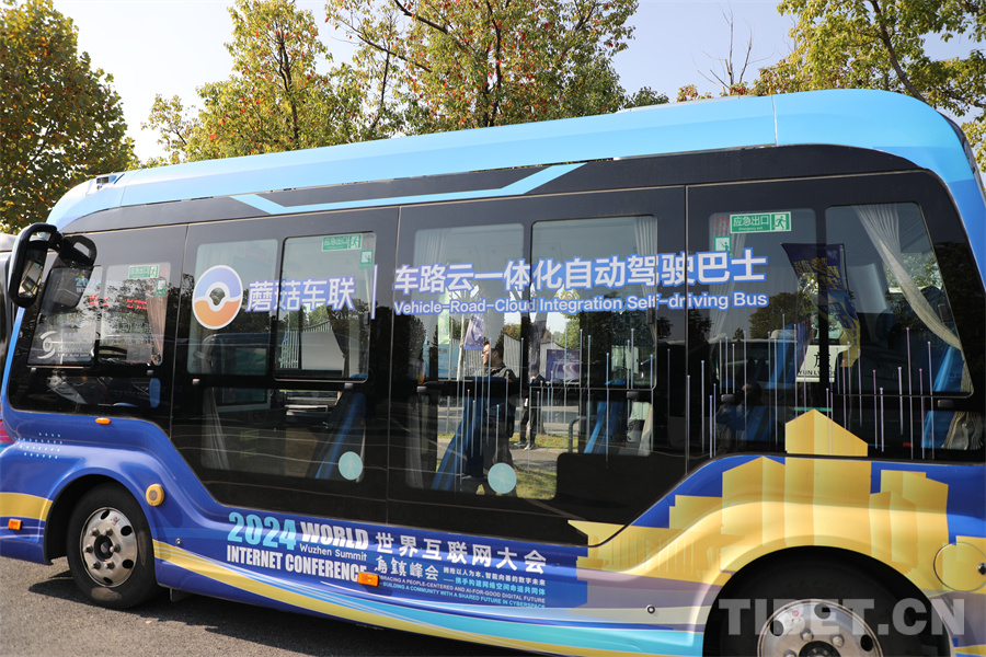 圖為車路云一體化自動駕駛巴士,這也是該巴士首次應用亮相世界互聯(lián)網(wǎng)大會烏鎮(zhèn)峰會,在既定路線里該巴士可以自動駕駛和規(guī)避行人車輛 攝影:王妍丹