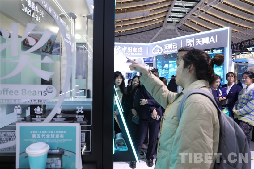 圖為游客排隊購買機器人咖啡,咖啡有幾十種選擇,幾十秒就可以制作完畢,在現(xiàn)場異?;鸨?攝影:王妍丹