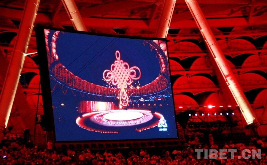 圖為第十二屆全國少數(shù)民族傳統(tǒng)體育運(yùn)動(dòng)會(huì)開幕式上以高科技方式呈現(xiàn)的中國結(jié) 攝影:劉莉