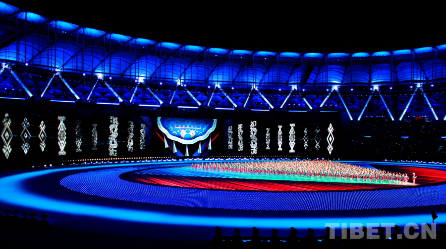 圖為第十二屆全國少數(shù)民族傳統(tǒng)體育運(yùn)動(dòng)會(huì)開幕式上,以各民族各地方的“錦繡”為主題的節(jié)目《融情匯聚》 攝影:劉莉