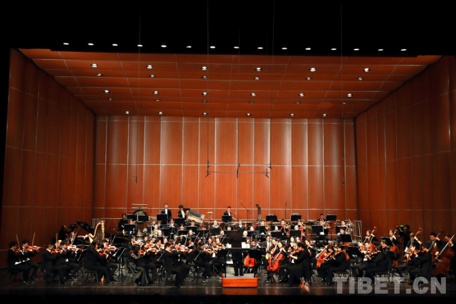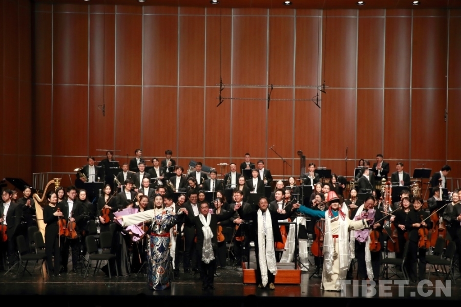 音樂會上,兩位藏族歌手演唱了交響樂主題曲《金橋》,歌曲高亢嘹亮、曲調(diào)悠揚。藏戲、山歌等元素的加入,讓交響樂更加豐富,充滿了濃郁的民族風情。