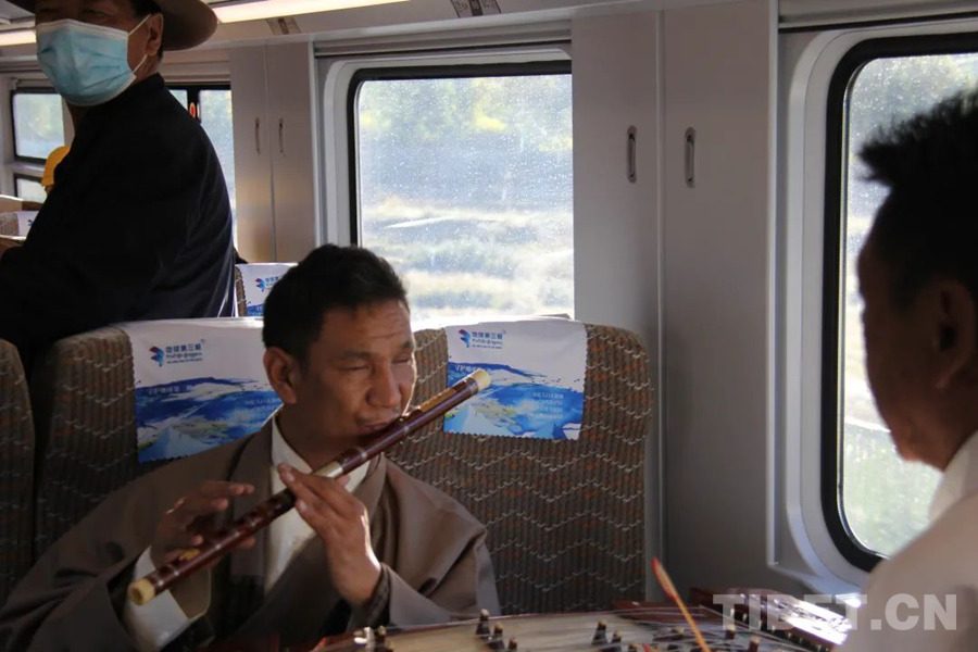 圖為在拉林鐵路開通運(yùn)營1周年之際,“咔噠嘎布”樂隊(duì)受邀在高原復(fù)興號上表演