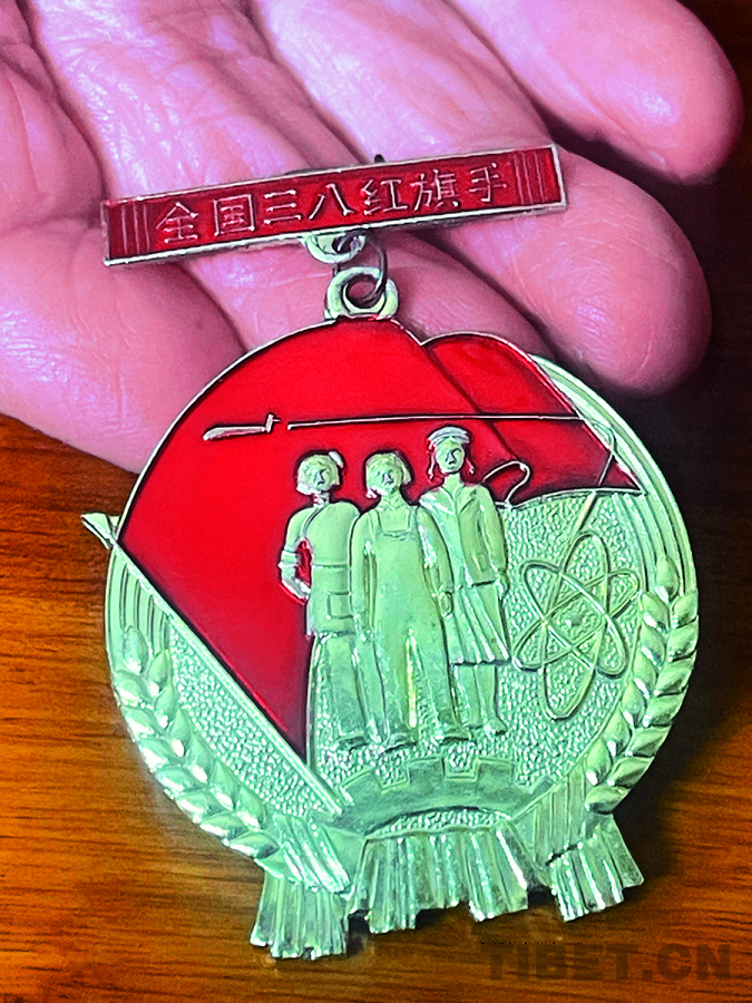 圖為巴西老人獲得的全國三八紅旗手獎章
