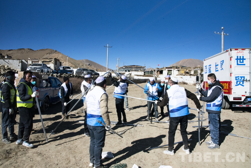 圖為在左措村地震安置點現場,山南市乃東區(qū)甘肅青海企業(yè)家商會愛心人士正在搭建物資發(fā)放帳篷 攝影:趙振宇