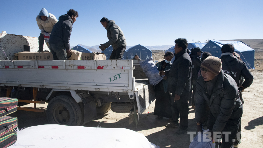 圖為定日縣曲洛鄉(xiāng)左措村安置點受災群眾正在有序搬運物資 攝影:趙振宇