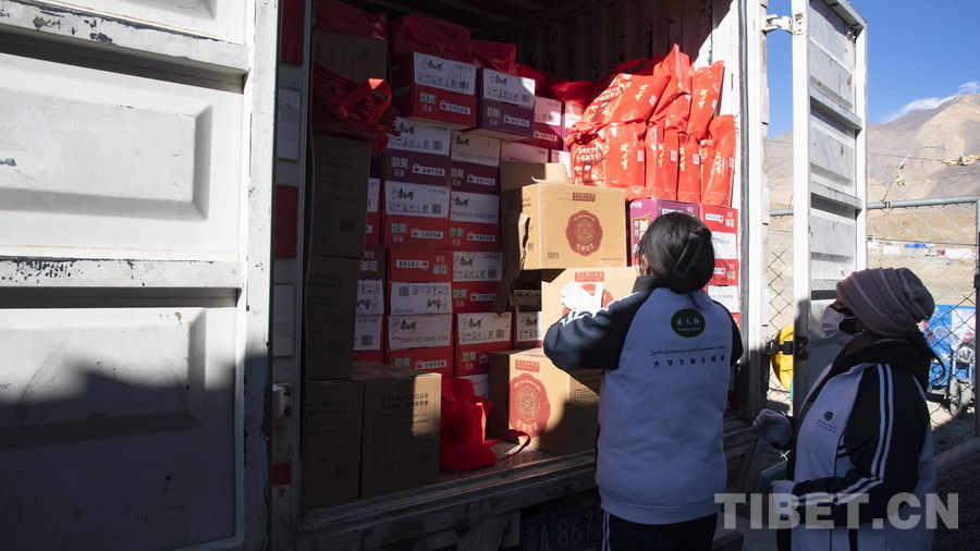 圖為西藏當(dāng)雄姆蘭農(nóng)業(yè)科技發(fā)展農(nóng)民專業(yè)合作社在嘎旦村受災(zāi)安置點(diǎn)發(fā)放物資 攝影:趙振宇