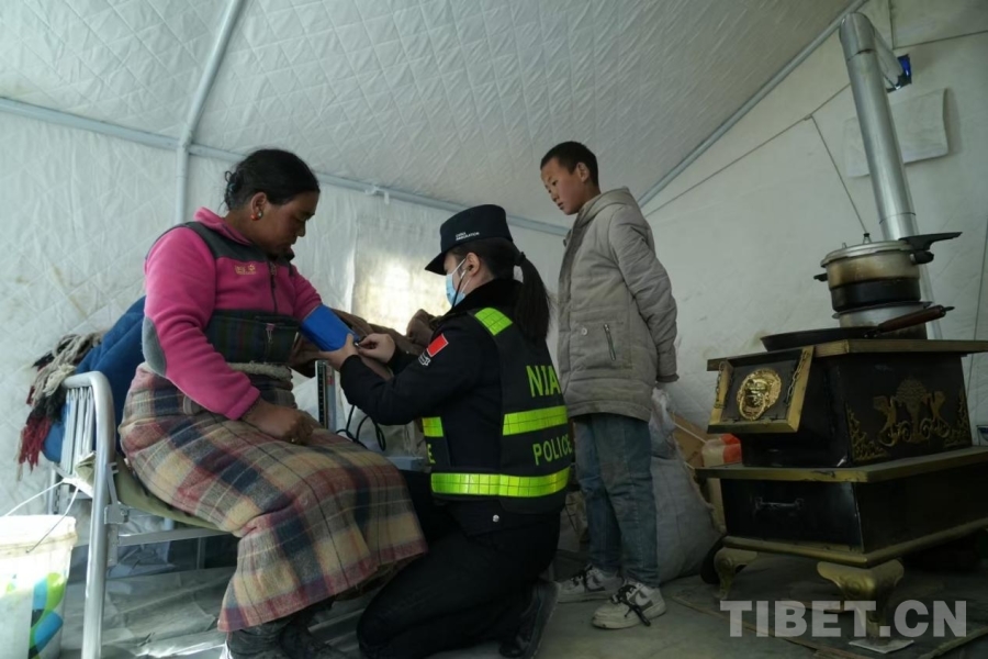 圖為在西藏定日縣長(zhǎng)所鄉(xiāng)玉白村安置點(diǎn),定日邊境管理大隊(duì)民警黃曉娟正在給災(zāi)區(qū)群眾量血壓 攝影:蔣美靈