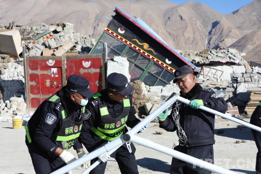 圖為在西藏日喀則市定日縣長(zhǎng)所鄉(xiāng)玉白村安置點(diǎn),移民管理警察為群眾搭建帳篷 攝影:郭遠(yuǎn)敬