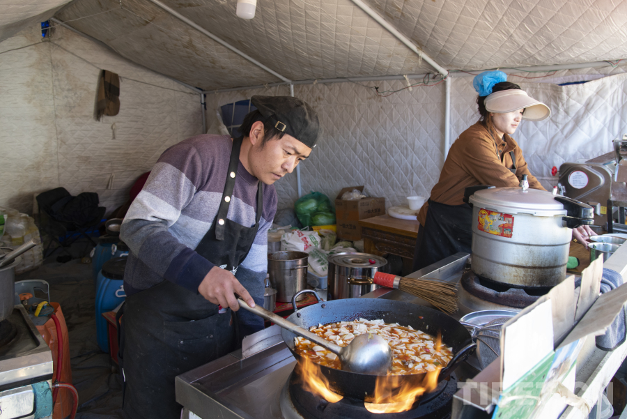 圖為在古榮村受災(zāi)群眾安置點,定日縣安多餐館的員工正在準備免費提供的餐食 攝影:趙振宇