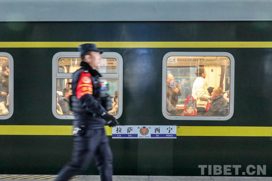 圖為春運(yùn)首日,拉薩站派出所民警普布在站臺巡視攝影:黃飛