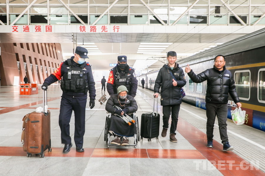 圖為拉薩站派出所民警羅松達(dá)哇(左二)與同事一起幫助殘疾旅客快速進(jìn)站,旅客豎起大拇指并不斷地說“托切那(謝謝)”攝影:黃飛