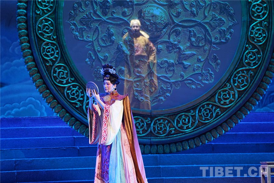 圖為《金城公主》演出現(xiàn)場(chǎng),和親會(huì)盟遭到破壞,金城公主在迷惘中通過(guò)銅鏡得到已故父親的指引 攝影:蘇洋