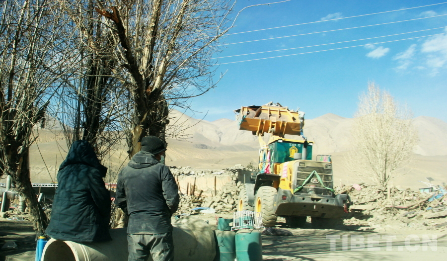 圖為地震重災區(qū)西藏自治區(qū)日喀則市定日縣長所鄉(xiāng)森嘎村除險現(xiàn)場,村民在觀看裝載機作業(yè) 攝影:劉莉