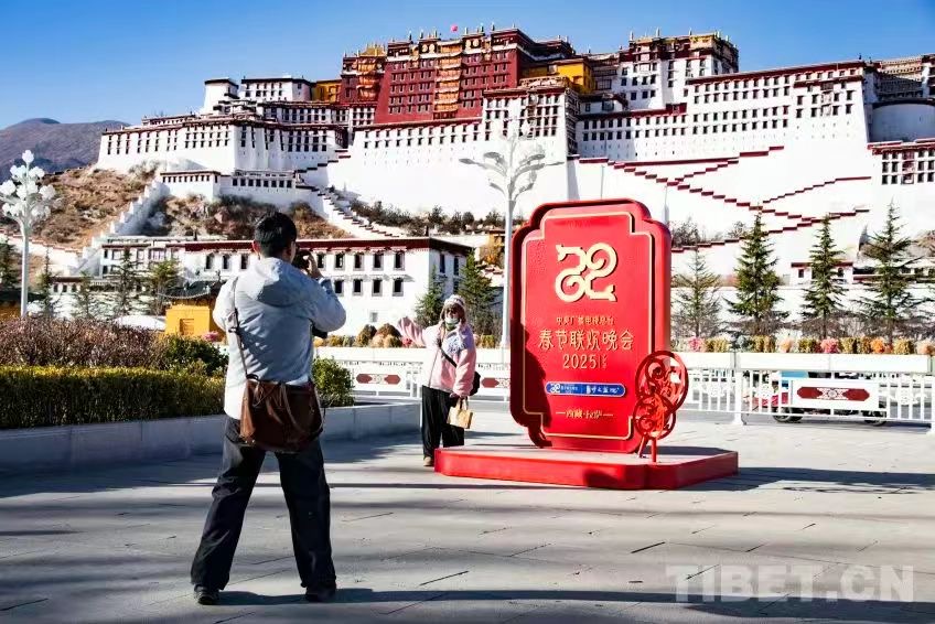 圖為游客在央視春晚西藏拉薩分會場標識前打卡 攝影:趙振宇