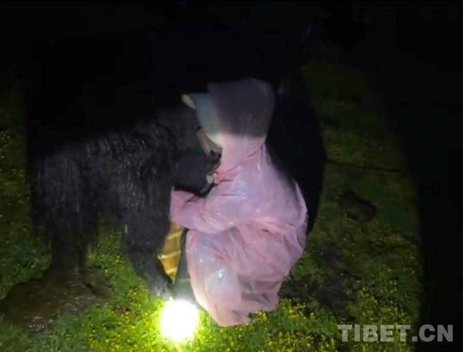 到了牛圈里,我發(fā)現(xiàn)大部分的牦牛都把腦袋斜靠在自己的肚子旁,閉著眼睛睡覺呢。我想很多人都沒見過牦牛睡覺的畫面吧?它們睡覺不是站著,而是躺下后前后腿全部收緊,把自己裹成一團,頭不是往前伸著,而是斜著貼緊自己的身體。過了一會兒,似乎是小牛犢們意識到了自己馬上就可以喝到媽媽的奶了,牛圈里開始傳來此起彼伏的叫聲;另一邊的牛媽媽們也開始作出回應。雖然在我聽來都是同一種叫聲,但在它們那兒似乎有著完全不一樣的意義。這是屬于它們自己的“加密語”。就這樣,在一聲聲“哞——哞——”的叫聲中,我們開始了今天的工作。