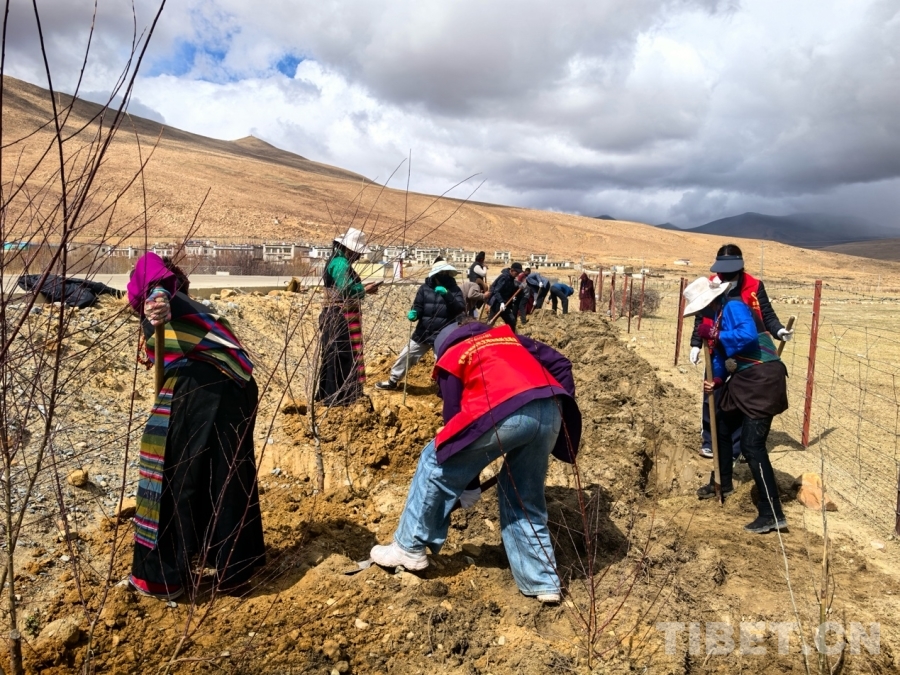 伴隨著一次次鐵鍬鑿擊地表的“嚓嚓”聲、此起彼伏的藏語勞動歌曲和樹苗抖動的“沙沙”聲,一排排規(guī)整的樹坑網(wǎng)格慢慢被鑿出,一棵棵象征希望的樹苗緩緩落下,一抔抔承載著綠色生命的黃土再次埋下,村主干道邊綿延80余米的“綠色生命線”初見雛形,120余棵樹苗挺立村道兩側(cè),以“綠絲帶”串聯(lián)村莊,為春日家園增添盎然生機(jī)。