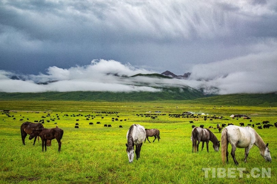 在這里,千百年來牧民們轉(zhuǎn)場放牧的古老智慧,讓草場得以休養(yǎng)生息;煨桑的裊裊青煙,將感恩與敬畏注入每一寸土地。在這里,阿萬倉牦牛以蹄印丈量時間,歐拉羊群如云影般掠過草原,河曲藏獒守護著草原的漫漫長夜,河曲馬踏響格薩爾王的千年傳說,它們都是舞動在高原上的精靈。