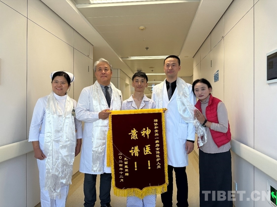 圖為受到救助的藏族患者向北京協(xié)和醫(yī)院骨科醫(yī)療團(tuán)隊贈送錦旗 攝影:楊眉笑