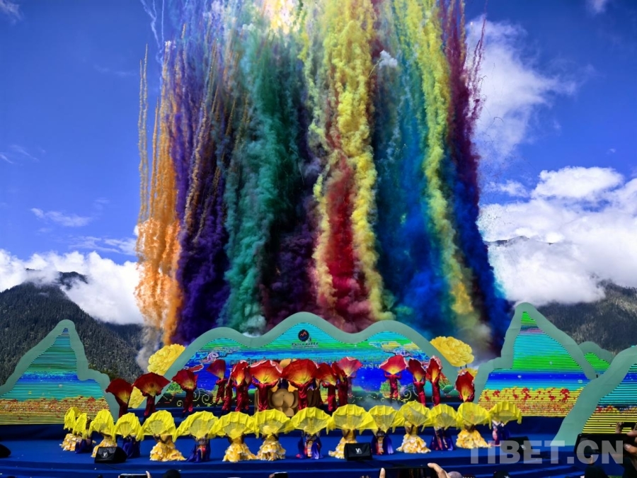 圖為5月28日,米林市第十七屆黃牡丹藏醫(yī)藥文化旅游節(jié)開幕演出在藍(lán)天白云下舉行。攝影:王淑