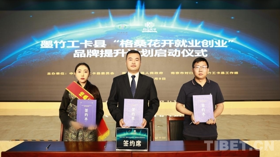 圖為貢覺卓瑪(左一)參加墨竹工卡縣舉辦的“格?;ㄩ_就業(yè)創(chuàng)業(yè)”品牌提升計(jì)劃啟動儀式并簽訂合作協(xié)議
