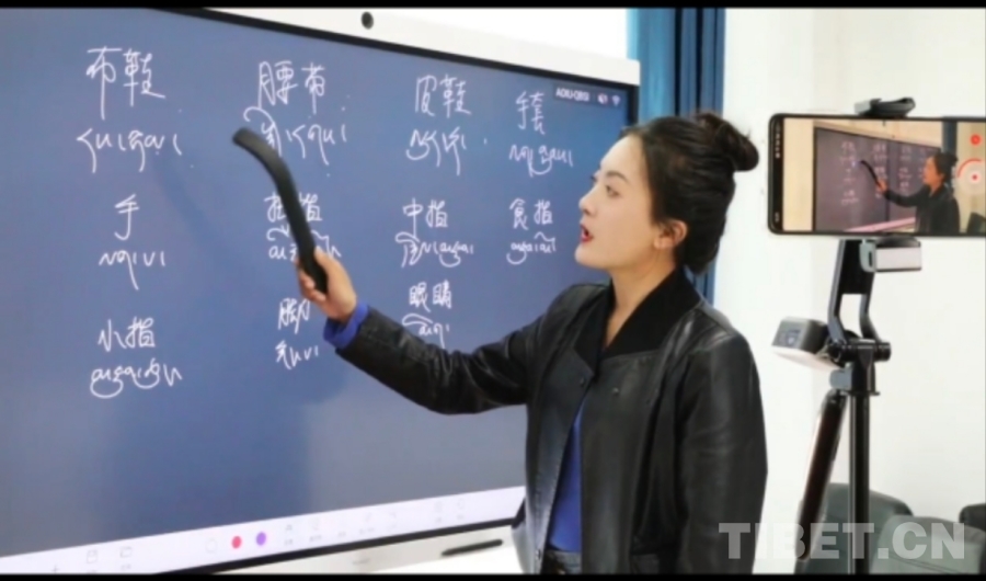 圖為次仁嘎措在給當(dāng)?shù)啬撩窠套R字 受訪者供圖