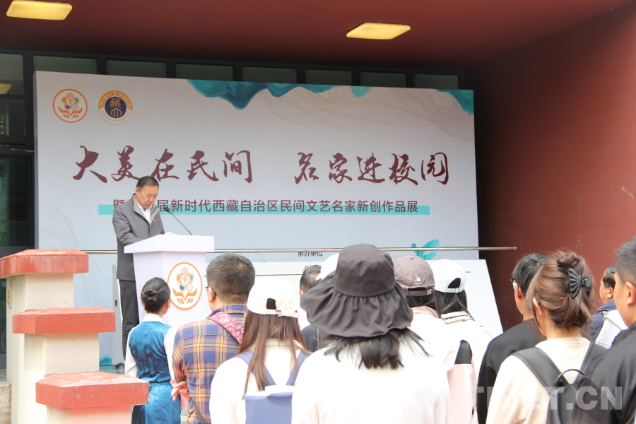 6月20日,“大美在民間——名家進校園暨第三屆新時代西藏自治區(qū)民間文藝名家新創(chuàng)作品展”開展。圖為西藏大學(xué)黨委常委、副校長王斌禮致辭 攝影:趙釗
