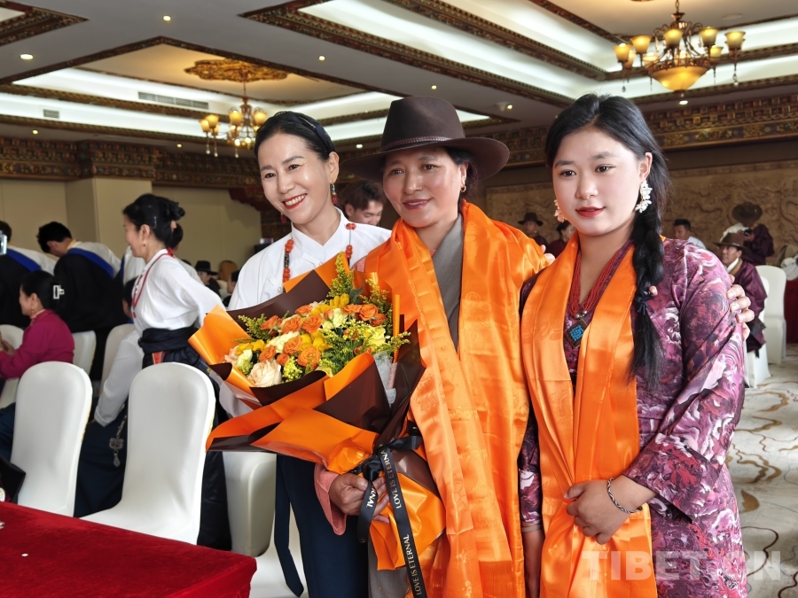 圖為活動(dòng)現(xiàn)場(chǎng)格桑措母女收到學(xué)員的鮮花和哈達(dá)
