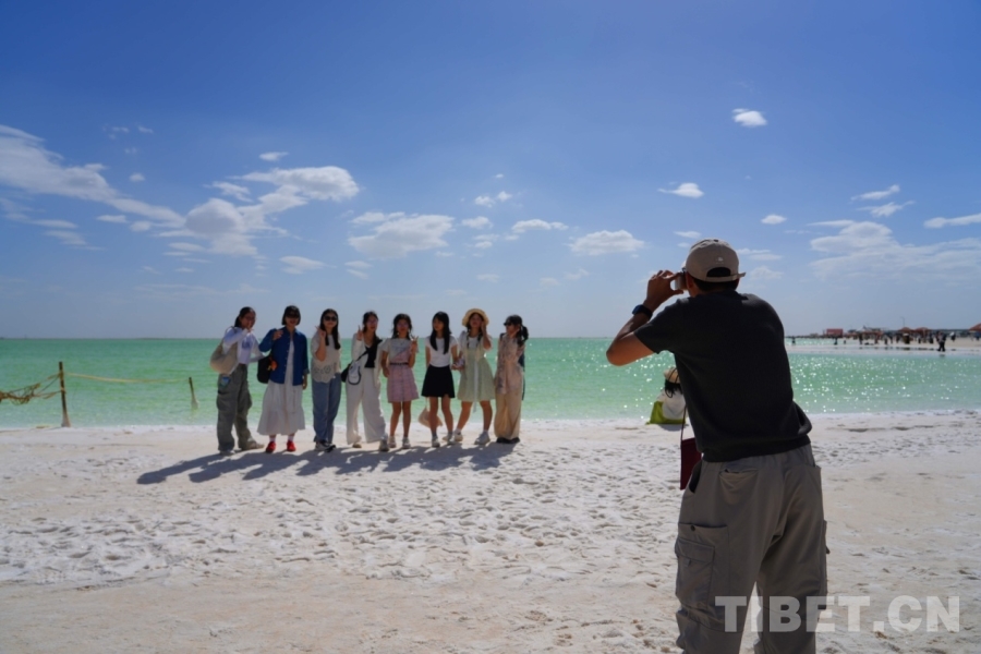 在海西蒙古族藏族自治州格爾木市,海拔2670米的察爾汗鹽湖,翠綠之美令人震撼,風(fēng)起波動(dòng),湖面如碎鉆鋪就的星河;天然形成的鹽花形態(tài)各異宛如珊瑚叢生,在陽(yáng)光下,閃耀著璀璨的光芒;浮在鹵水上的“萬(wàn)丈鹽橋”延伸至天際,橫跨湖面,還有周邊的現(xiàn)代化采鹽船,輸鹵管道,車(chē)來(lái)車(chē)往,工業(yè)設(shè)施與自然景觀形成強(qiáng)烈對(duì)比。來(lái)自妙法寺劉金龍中學(xué)三位女生欣賞著美景,也紛紛討論這次令人驚嘆的“自然課堂”。鐘澄情同學(xué)不自禁感慨:“這里跟網(wǎng)上宣傳的一樣美!就像是上帝打翻的蘋(píng)果汁?!痹袂缤瑢W(xué)驚嘆道:“曾經(jīng)我只聽(tīng)說(shuō)過(guò)茶卡鹽湖,來(lái)到這里才知道察爾汗鹽湖是中國(guó)最大、世界第二大的鹽湖,面積相當(dāng)于56個(gè)茶卡鹽湖,鹽儲(chǔ)量可以讓全球80億人吃上兩千年。”而許馨月同學(xué)更加震撼這里工業(yè)與自然相互交融的獨(dú)特魅力,直呼這是一座真正的“寶庫(kù)”!
