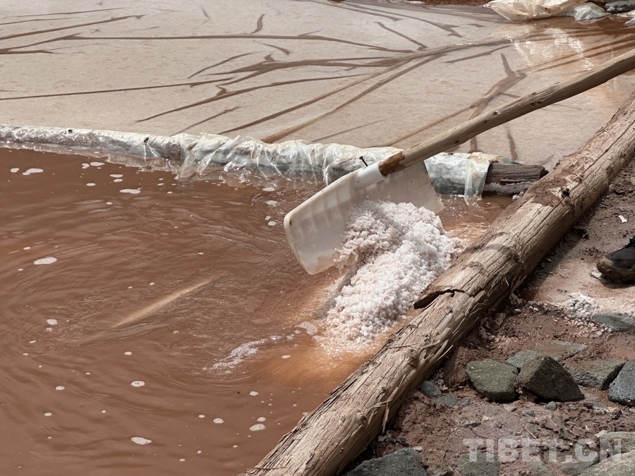 白扎鹽場出產(chǎn)的鹽有白鹽與紅鹽兩種,圖為江羊巴桑正在向我們展示白鹽的制取過程。可以看到,盡管鹵水呈現(xiàn)較深的紅褐色,但初步制取的鹽仍然呈現(xiàn)雪白的顏色。攝影:畢然